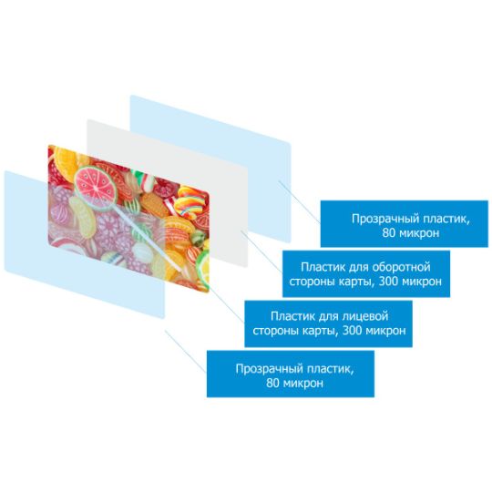 - Наши пластиковые карты изготавливаются по "классической" технологии из 4-х слоев пластика, которые спекаются под высоким давлением и температурой, образую при этом монолитную жесткую структуру толщиной 0,76 мм. Изображение и печатные переменные данные оказываясь под слоем ламината, надежно защищены от внешних воздействий.